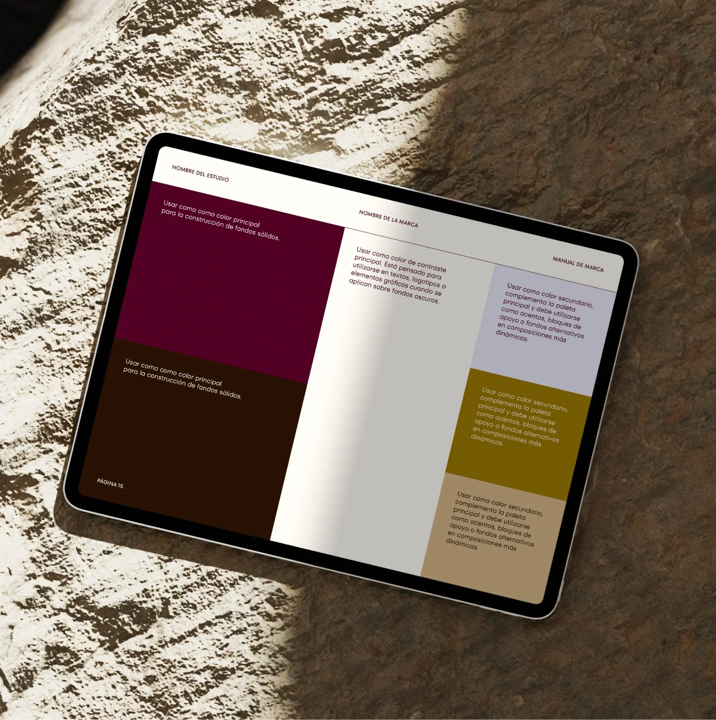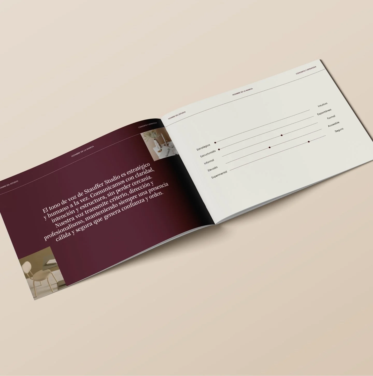 Este es el documento que organiza y aterriza todo el sistema visual de la marca. Es la plantilla pensada para presentar de forma clara cómo debe usarse la identidad una vez aprobada.